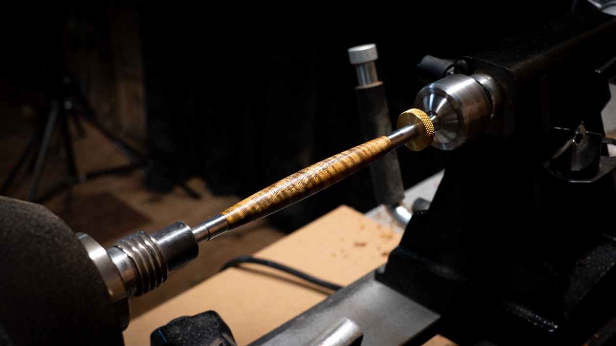 次に、木工旋盤という機械を使って、ペンの形に削っていきます。
