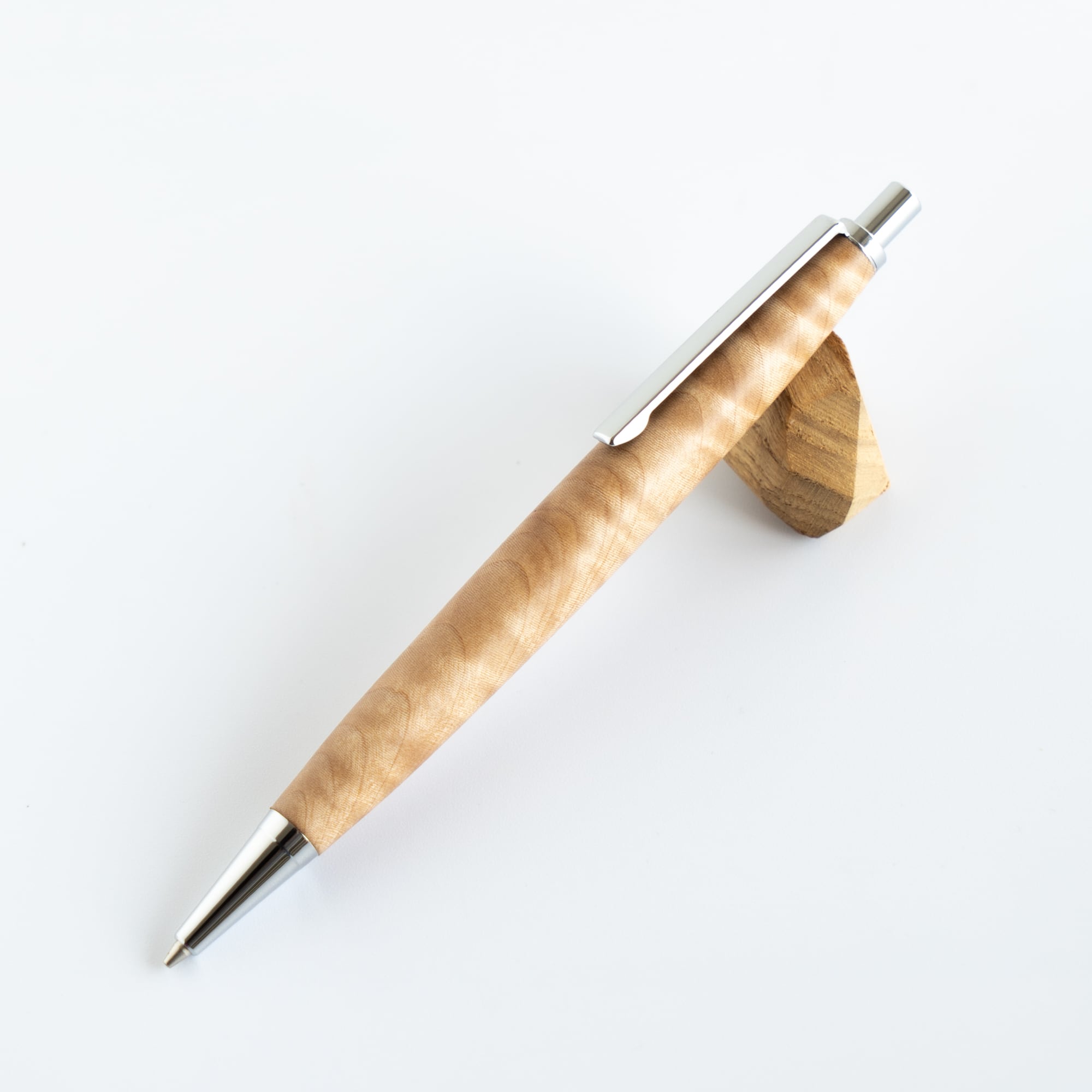 軸全体に細かく波打つような美しい杢目が広がり、光の当たり方によって表情が変わるのが特徴です。